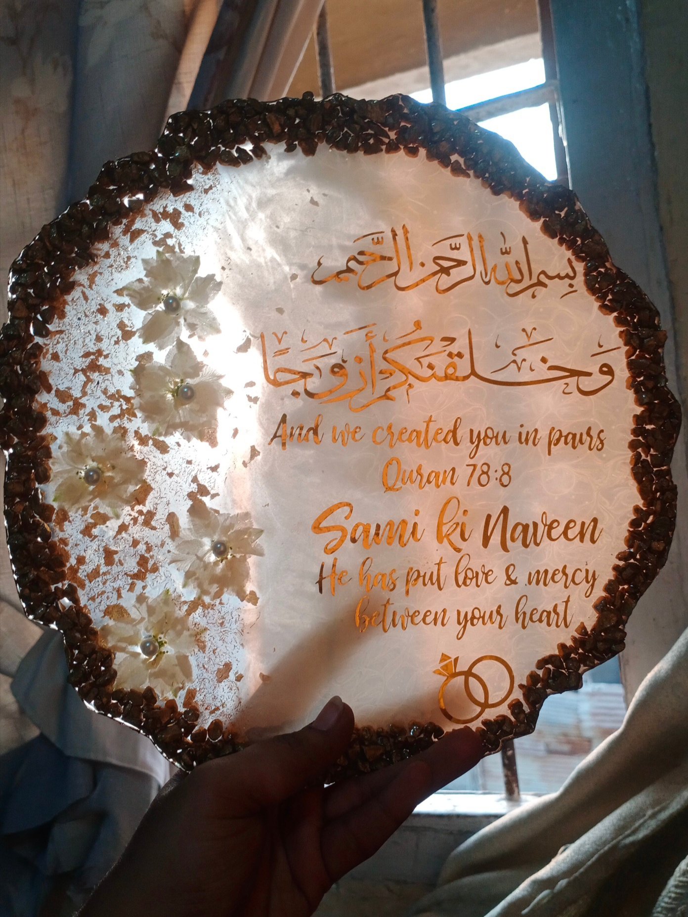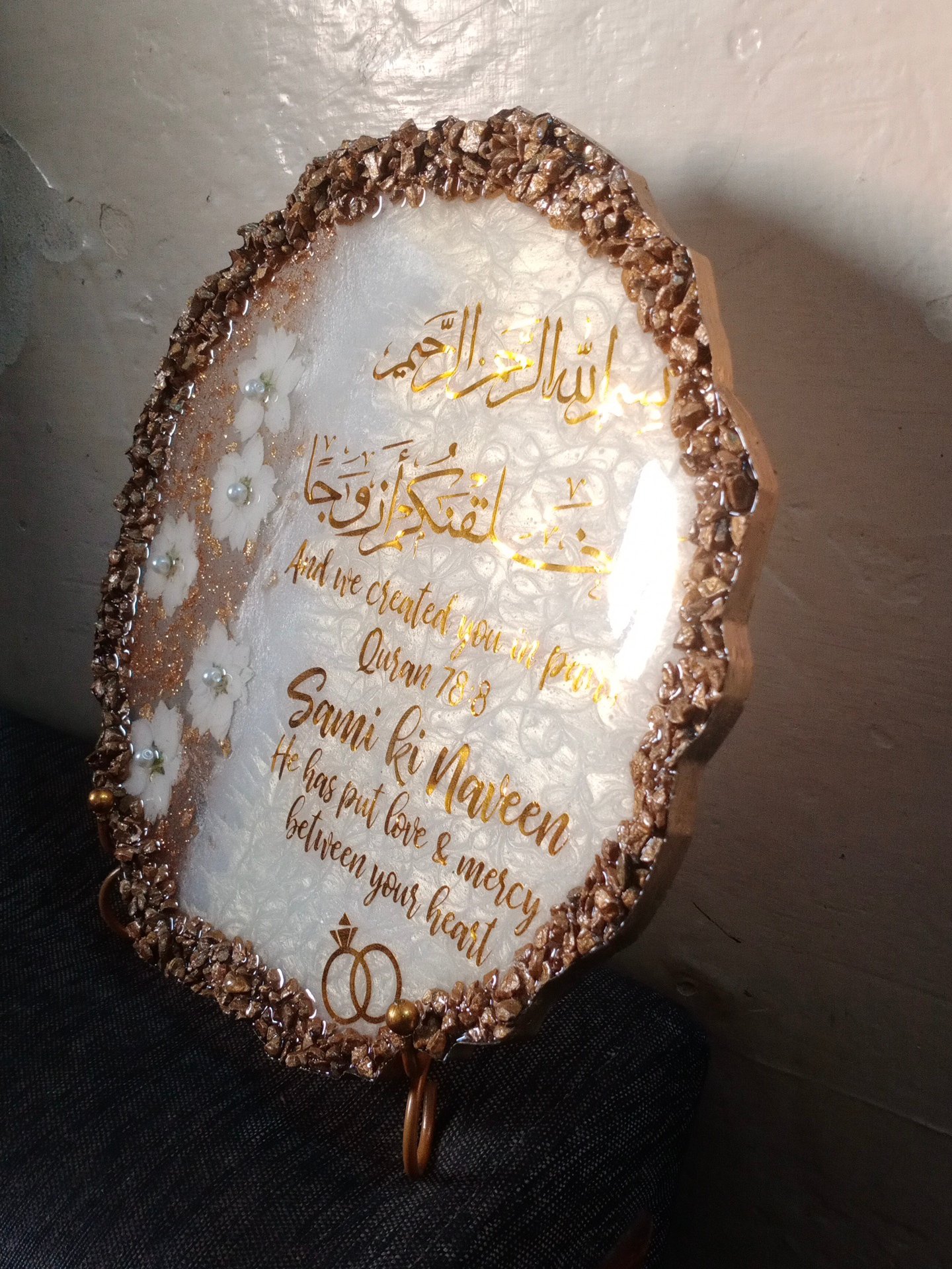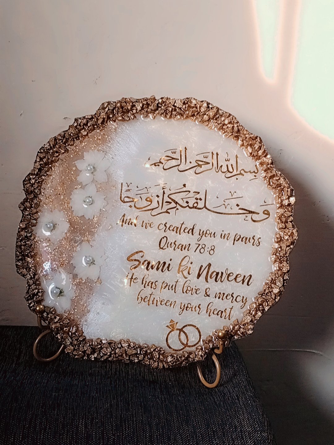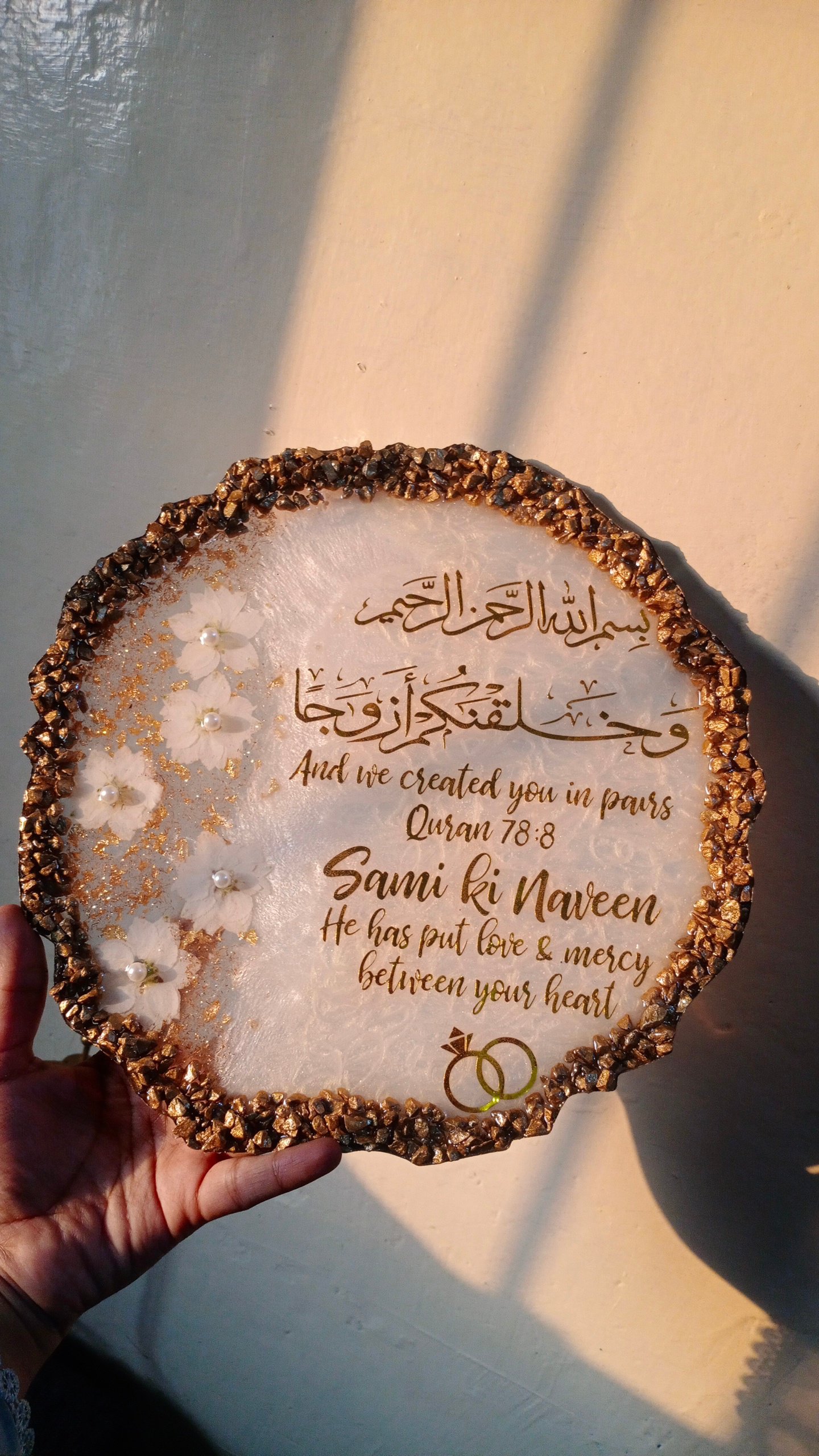 Elegant bespoke 10′ inches resin Nikkah plaque with personalized names & a sacred Quranic verse, a timeless wedding keepsake of love & mercy💎